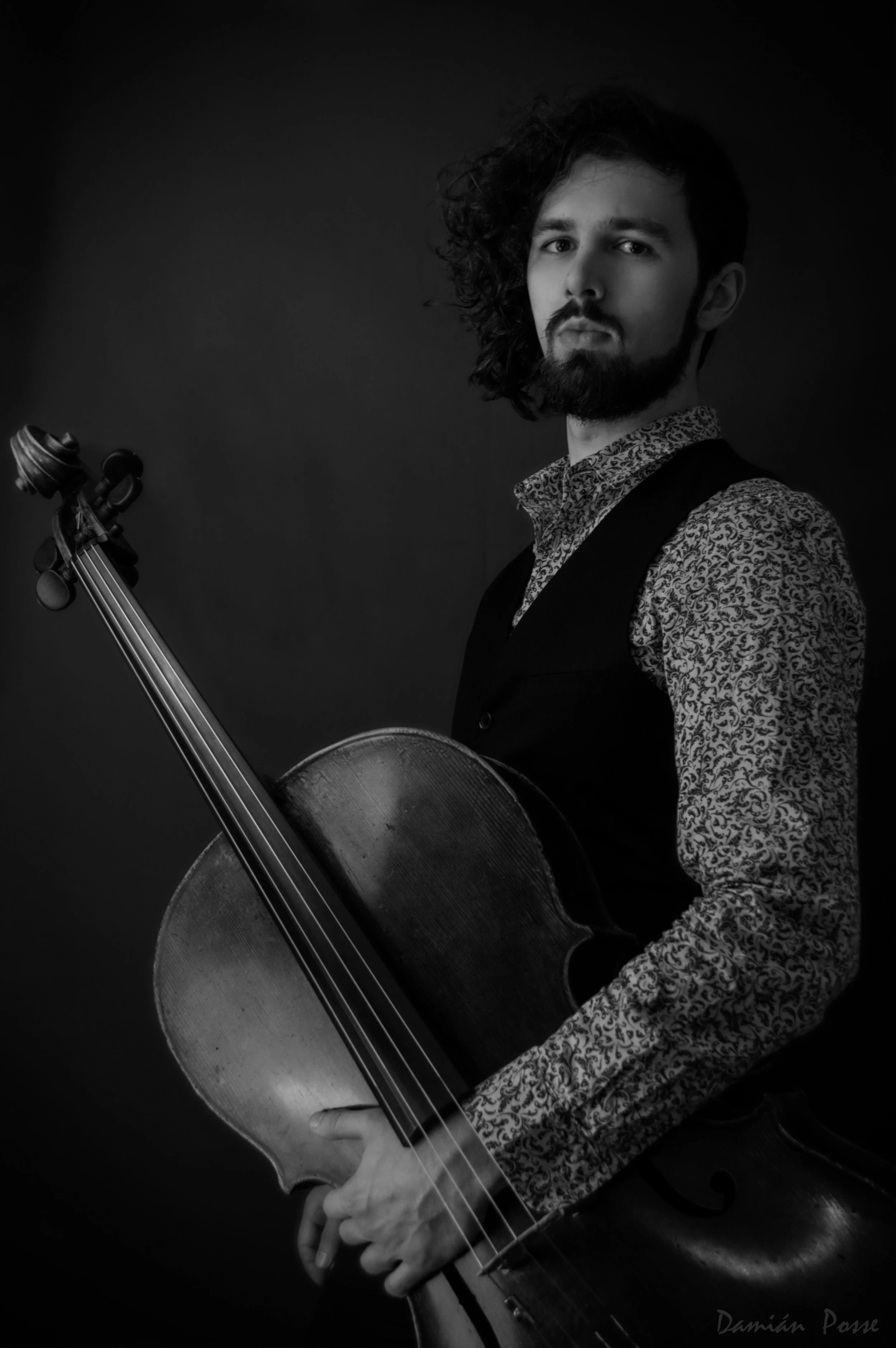 Black and white portrait of a man with curly hair and a beard, holding a cello over his shoulder, dressed in a light shirt and dark vest, against a dark background.